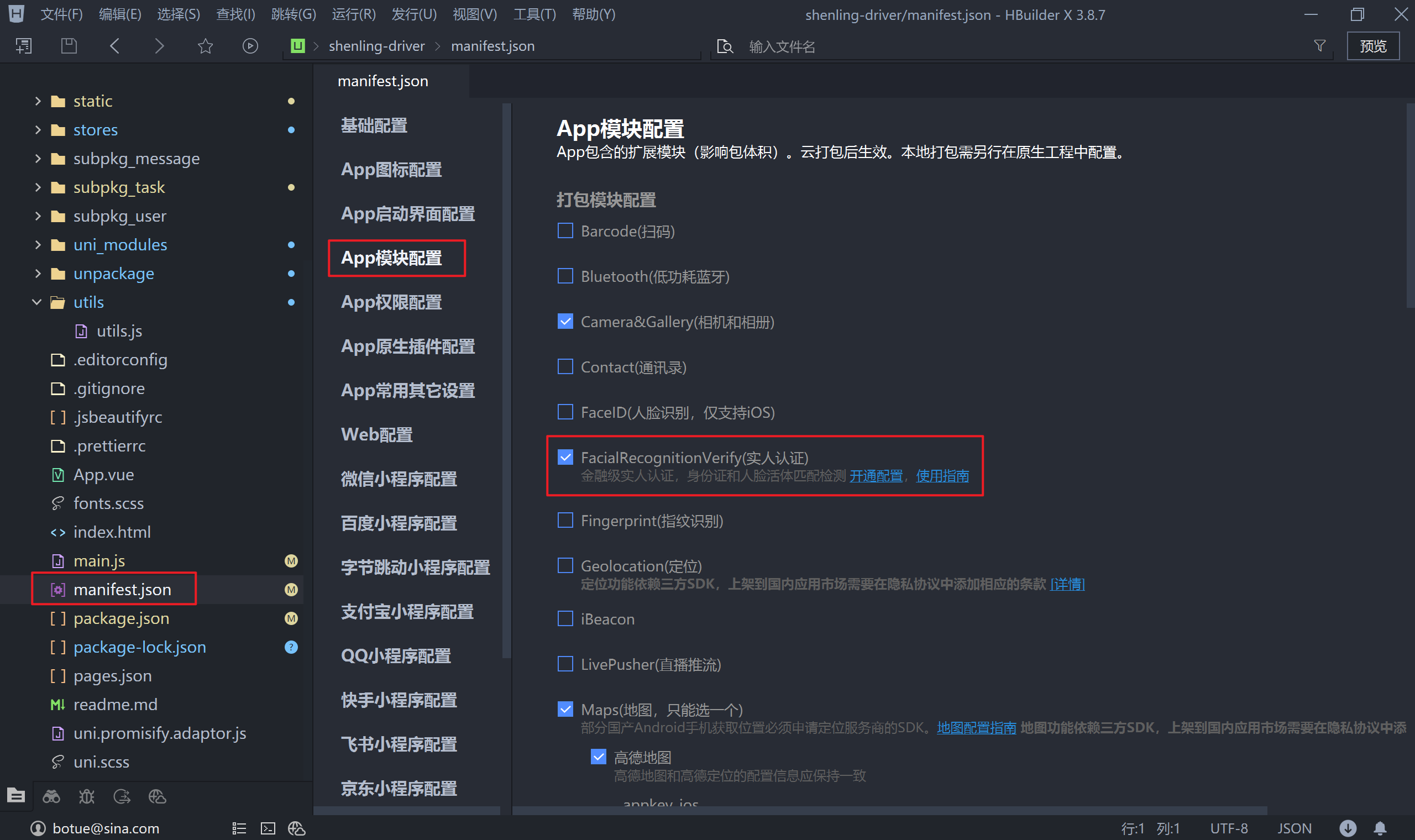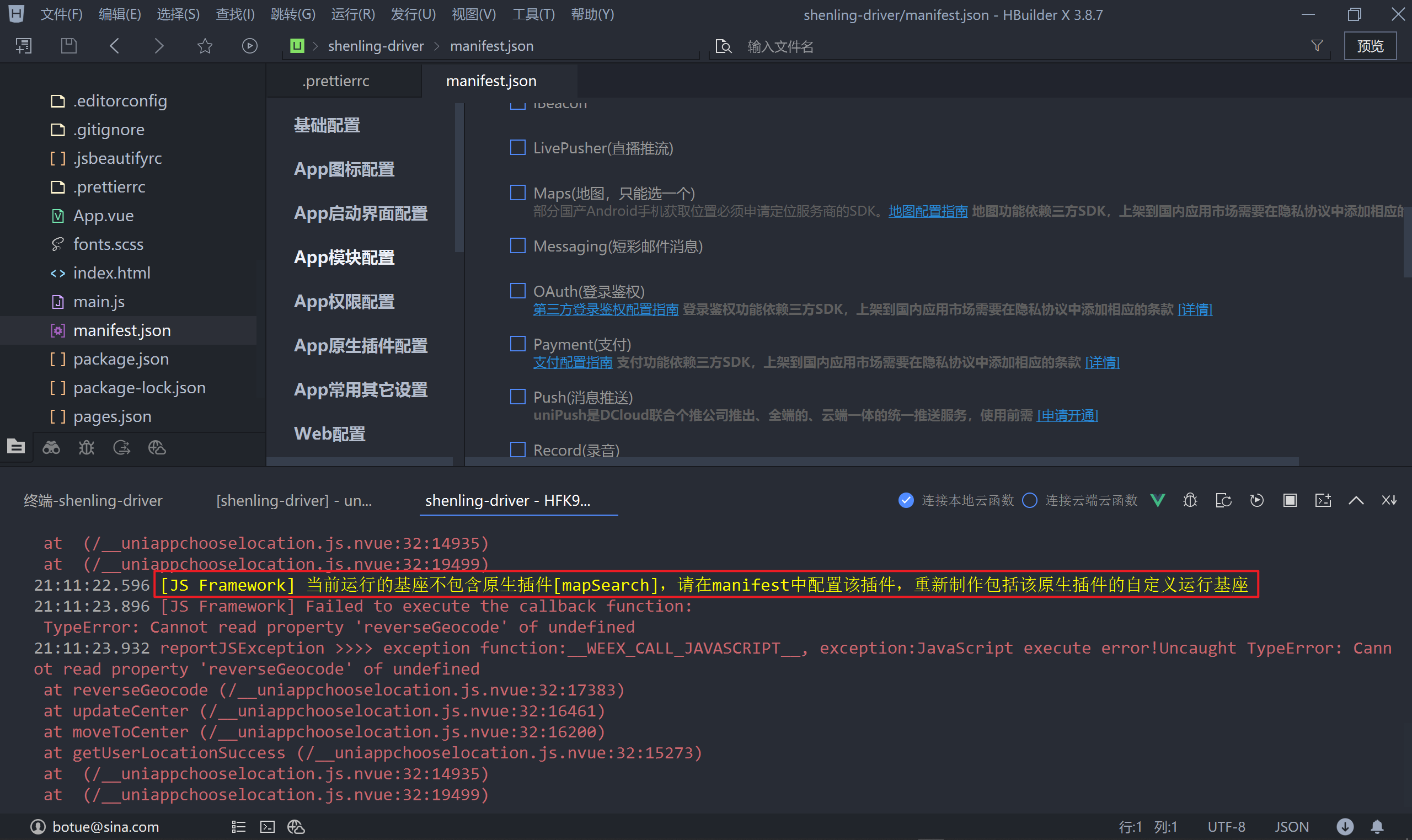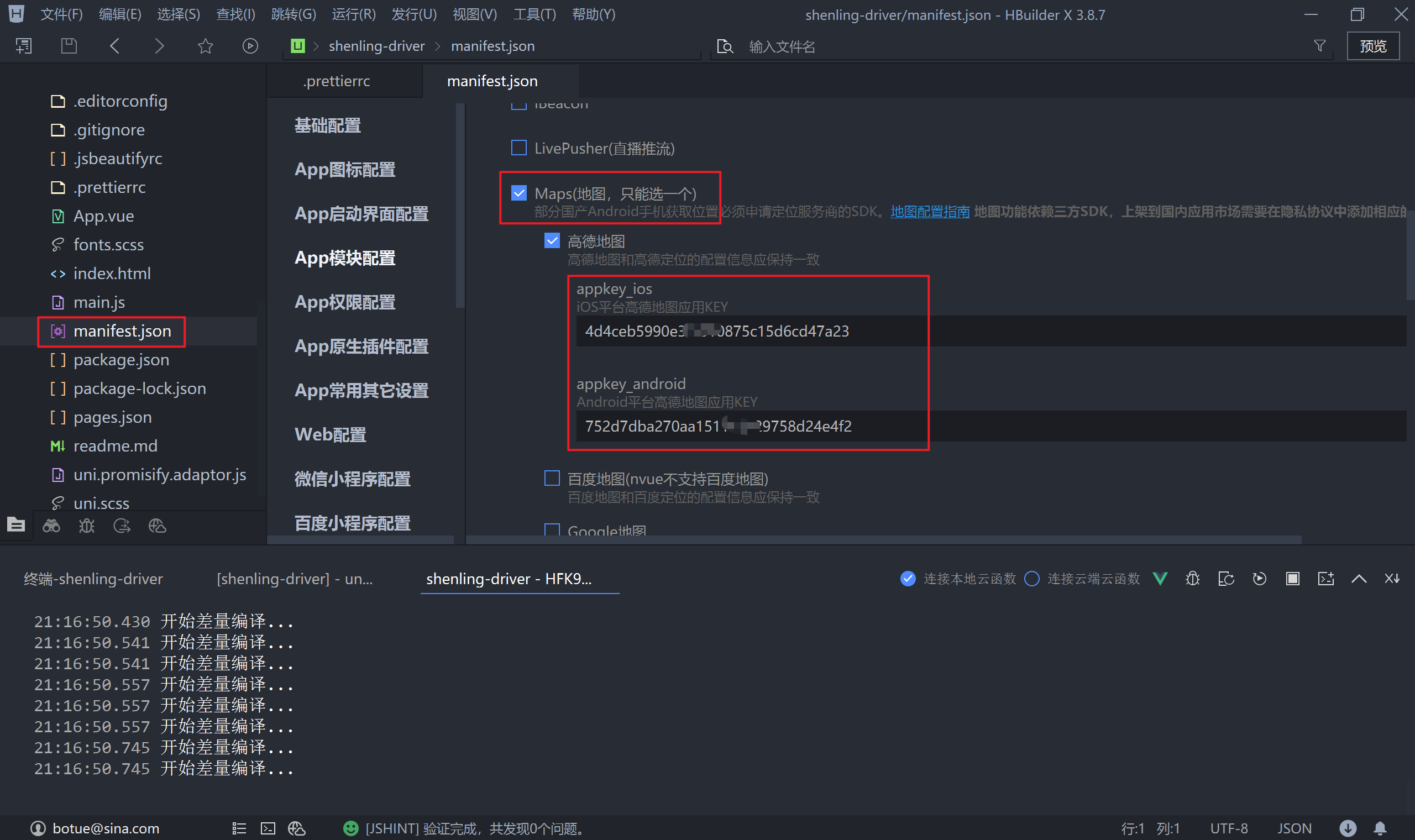 把在高德地图创建的 Key 填写到图示位置,IOS 的 key 可以省略也可以随便填写一个,然后重新打包自定义基座,打包后运行 App 项目,验证上报异常位置时是否可以打开地图。