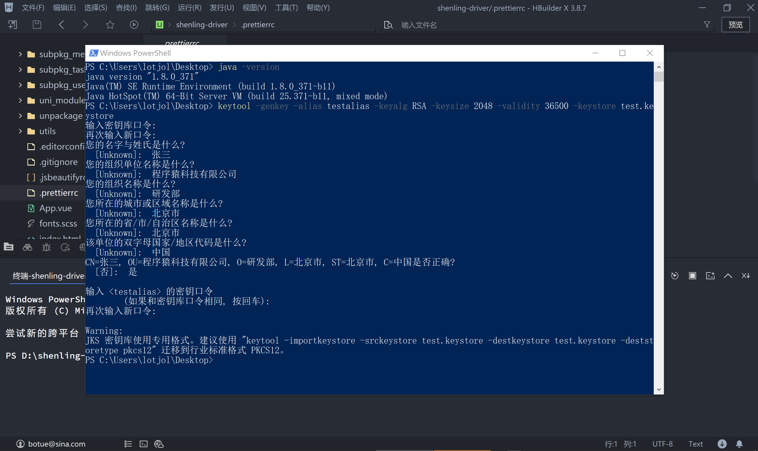 此时在执行命令的目录中就生成了一个 xxxxx.keystore 文件,即安卓证书了,同时还有一个 xxxxx.keystore.old 的备份文件,这个文件执行警告代码之前的证书文件,我们将这两个文件放在一起保管就可以了。